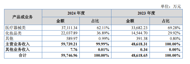 近两年的财务数据显示出公司强劲的增长势头。具体来看•,绽妍生物主营业务分为医疗器械类(医用敷料产品)和化妆品类两大板块。2023年至2024年,医疗器械类产品收入分别为3-.37亿元▲★=、3.71亿元,占总营收的69.28%、62■.11%。