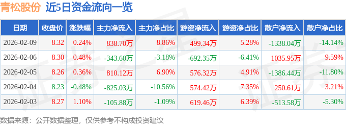 2月9日的资金流向数据方面,主力资金净流入838.7万元,占总成交额8.86%,游资资金净流入499.34万元,占总成交额5.28%,散户资金净流出1338.04万元,占总成交额14.14%。