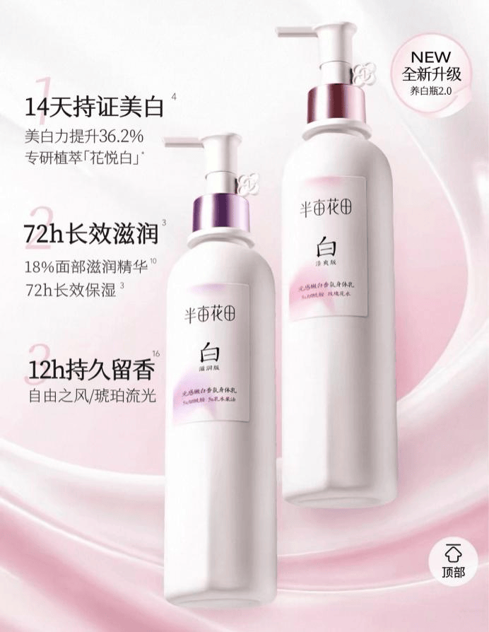 以身体乳为例,半亩花田身体乳产品线年就已上市,但现在卖的最好的是2023年推出并在随后两年升级的美白身体乳。